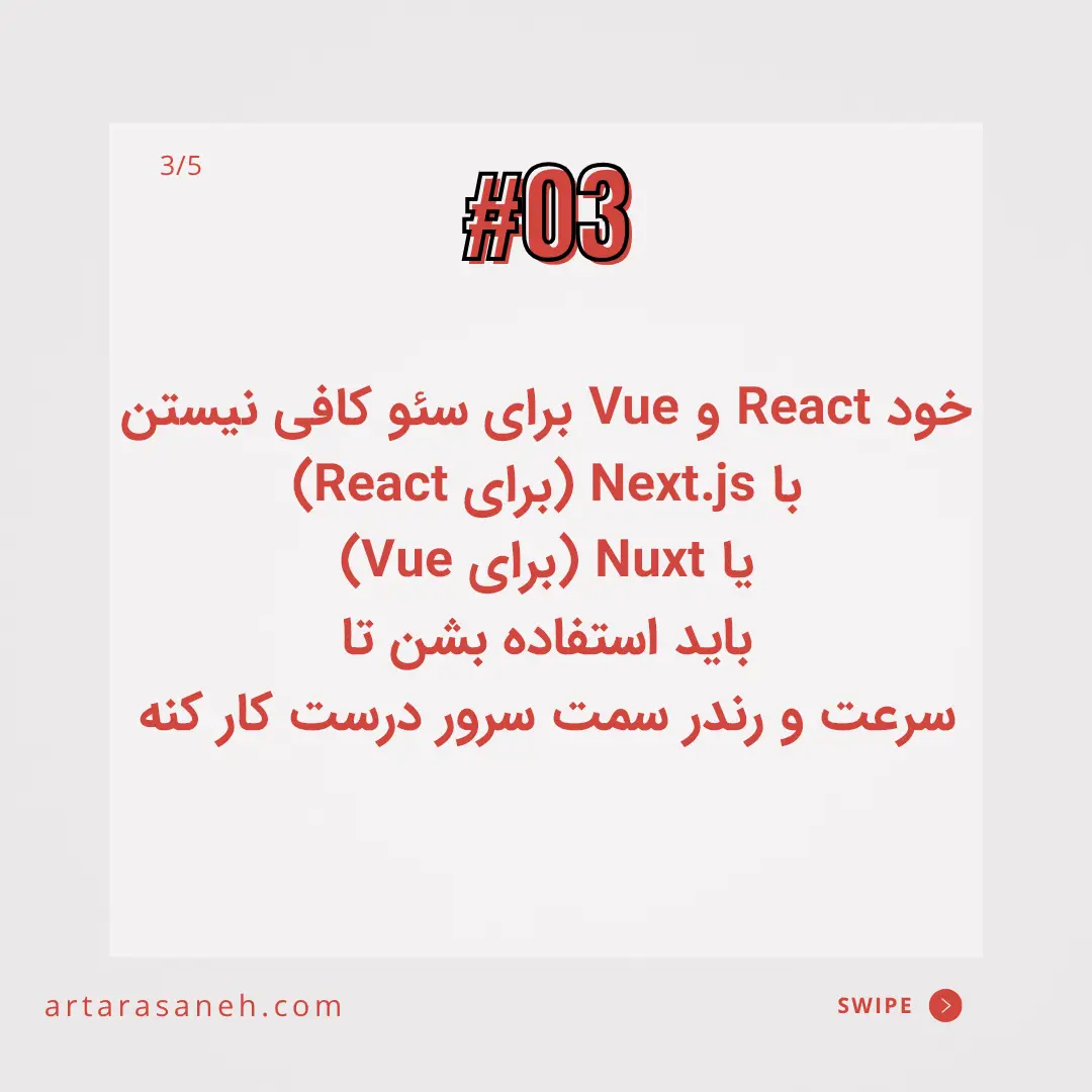 فریمورک خالی (React یا Vue) برای سئو کافی نیست؛ باید با متا-فریمورک مثل Next یا Nuxt استفاده بشه تا رندر سمت سرور، سرعت بالا و سئو حرفهای به دست بیاد.